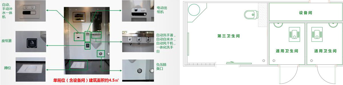 艺术公厕有两个男女通用间,一个第三洗手间。运用了自动开关门系统、地面自动清洁系统、马桶自动清洁系统、语音提示系统等智能化装置,各个系统通过智能处理器连接控制,在工作间配备了液晶触摸屏,可以根据每个厕所使用地人流量、天气、温度灵活设置清洁时间长短和清洁频率,还可根据客户需要扩展紫外线消毒、臭氧消毒等多种功能。
